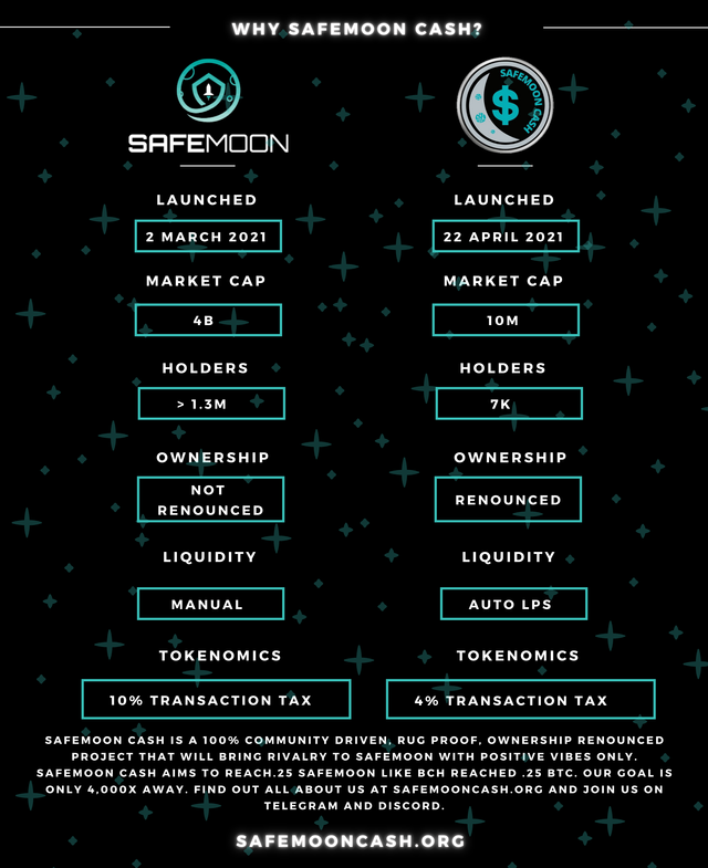 Safemoon Cash wurde Ende April 2021 von Mitgliedern der BSC-Community heimlich eingeführt, nachdem Safemoon eine Marktkapitalisierung von über vier Milliarden Dollar erreicht hatte. Mit seiner hohen Transaktionssteuer profitieren die frühen Inhaber von Safemoon am meisten. Safemoon Cash bietet den Inhabern passive Belohnungen durch statische Reflexion. Durch das Einbetten von Safemoon Cash in einen Pool beschafft es sich sein eigenes Kapital und sichert so die Liquidität. Wir glauben, dass unsere Tokenomics denen unseres großen Bruders überlegen sind.